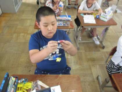 理科「電池のはたらき」の単元で,電池の向きとプロペラの回る向きの関係を調べました。