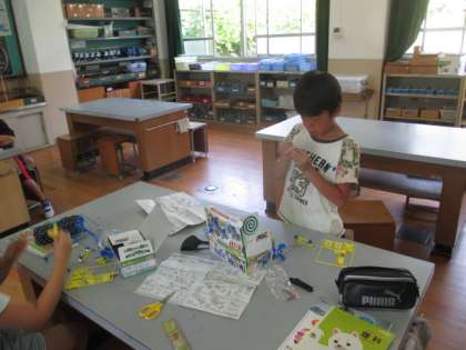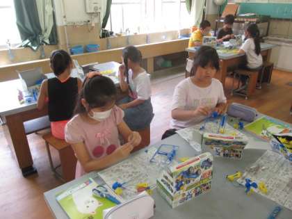 理科の時間に電池回路のスイッチを作りました。スイッチをオンオフすることでモーターを回すことができることに大喜びでした。