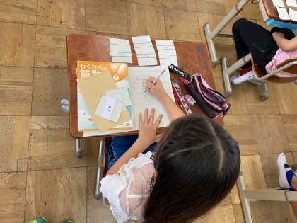 算数の「1けたでわる割り算の筆算」の学習で,色紙を実際に分けながら,問題を解きました。紙を動かして,式を立てて自分の考えをノートに書くことができました。