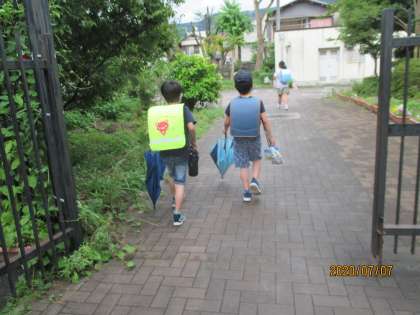 傘をさしての登下校,安全に気をつけて歩いてほしいです。雨でも水分をよくとるので,水筒は忘れずもってきてくださいね〜