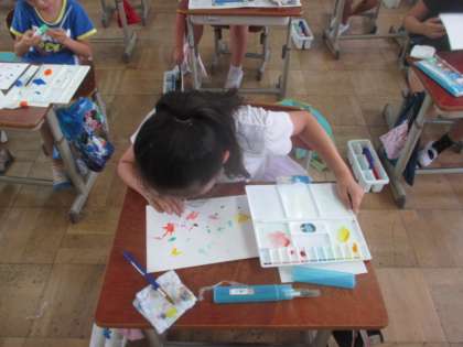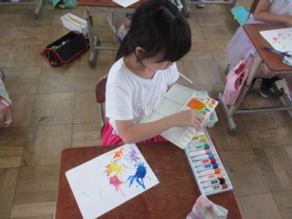 前回に続き,絵具を使った技法の学習をしました。自分たちの思い思いの模様を描くことができていました。ストローで絵具を吹くので,ストローを加えながら,描いていました。