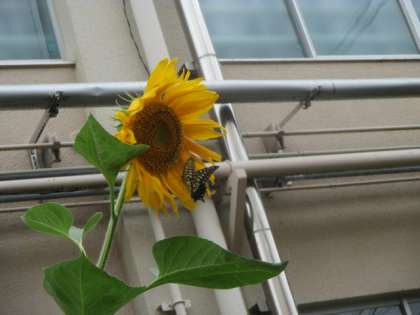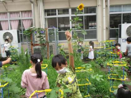 一生懸命つるをほどいていると,1年生のひまわりにアゲハチョウがとまっているのに気づいた子どもたち。大きな歓声があがりました!