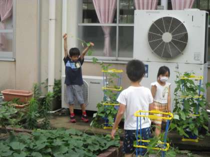 みんなが育てているあさがお。元気すぎてどんどん大きくなっています。自分のつるが,お友だちのつるや室外機のフェンスにからまっている人も多く,ほどくのに一苦労。この雨でますます大きく育ってくれそうですね。
