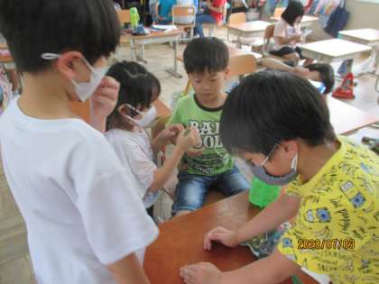 雨の日も,虫かごをみんなで囲んで虫の観察をしている子どもたちです。