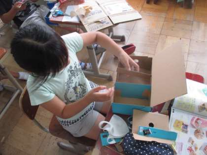 図工の時間に段ボールを使って,小物入れを作っています。四角いものから丸型のものなど形も様々で,中に仕切りを作るなどたくさん工夫をしていました。