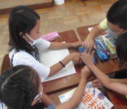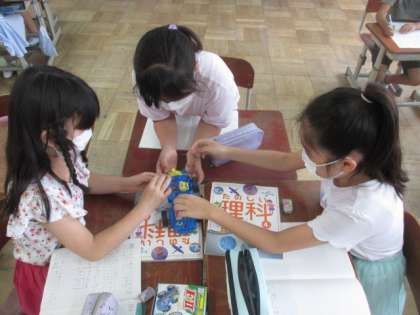 理科の時間にモーターカーの回路の間違ているところを探すという活動をしました。班に分かれて直すところを探して,上手に直すことができていました。