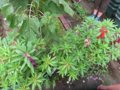 学校園で育てているひまわり,ホウセンカ,ダイズ,オクラ,なす,さつまいもがすごく成長しています!