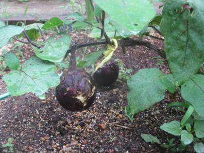 ひまわりは子どもの身長を大きく超え,ぐんぐん育っています。なすも大きな実が増えてきました!