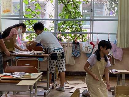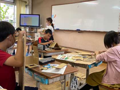 図工では,段ボールで小物入れを作成しています。段ボールカッターやボンドを使って,切ったりくっつけたりしてオリジナルボックスを作っています。上から絵の具も塗るので,どんな作品ができるのか楽しみです。