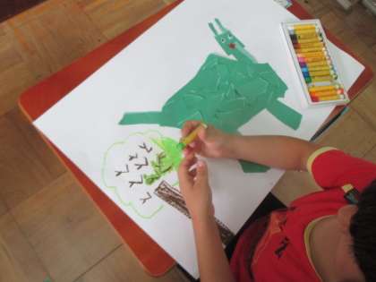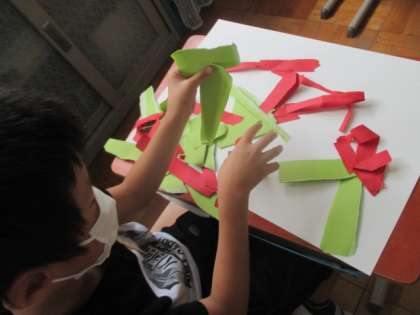 画用紙をびりびりとやぶいてできた形をつかって,作品を作りました。