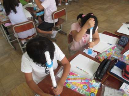 閉じ込めた空気と水に散らかを加えるとそれぞれの体積はどうなるのかについて調べました。力いっぱいピストンを押して確かめていました。