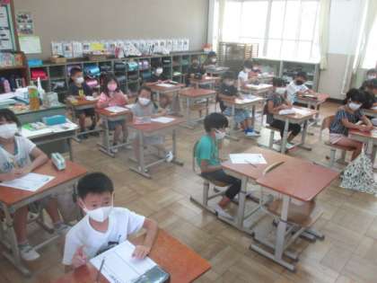 こんがりと日焼けして元気な顔で登校する子もいれば,「まだ夏休みがよかったな。」と話している子もいました!
