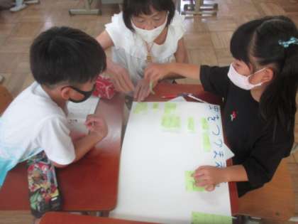 今日の国語の時間に,「山小屋で三日間過ごすときにしたいこと」というテーマをもとにグループごとにわかれて,「山小屋に持っていきたいもの」は何か,付箋に書いて意見を出し合いました!