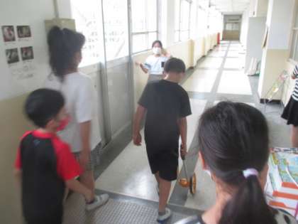 1組の算数の学習は,北校舎の廊下の長さがどれくらいなのか測ってみました!