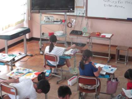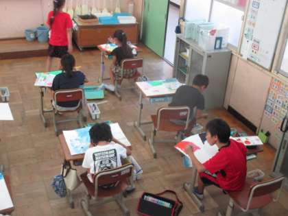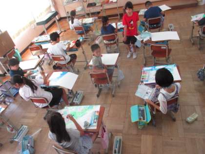 図工の時間にお話を絵にかくという活動をしました。春と秋それぞれの情景を描き,その被害を表現していました。