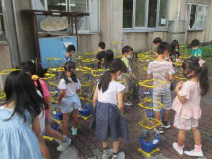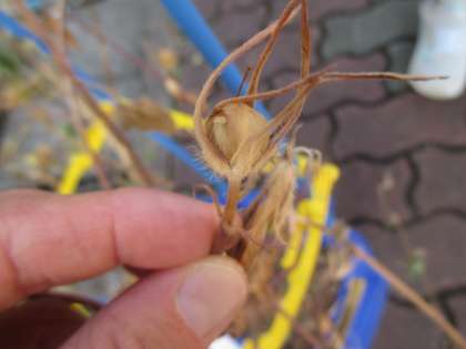 花が咲き終わり,枯れ始めてきたあさがお。ちょっぴり寂しくなりますが,新しい命に出会えました。花が咲き終わったあとにできる種を,一生懸命探しました。「こんなところにもあった!」と探すのを楽しんでいましたよ。