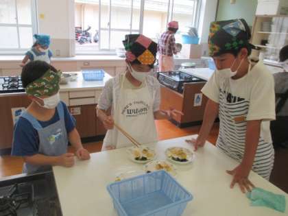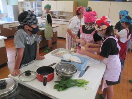 家庭科の学習で「青菜のおひたし」と「ゆでいも」を作りました。