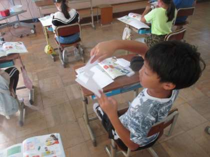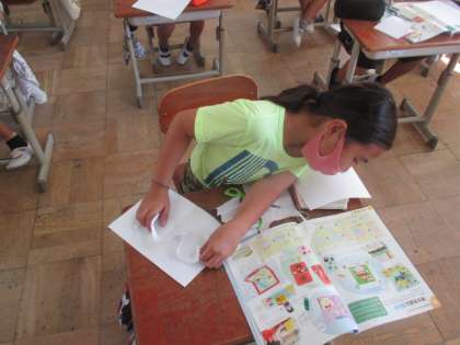 図工の時間に「幸せを運ぶカード」という単元の学習をしました。だれにどんな内容をかくかと,仕掛を考えました。