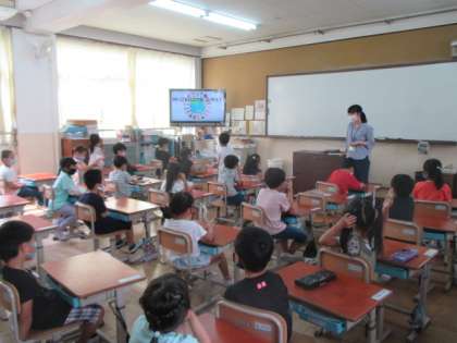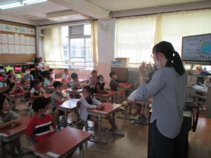 日本語教室の劉先生に,外国の文化について教えてもらいました。食事や服装,小学校生活など,写真をたくさん見せてもらいながら,いろいろな話を聞きました。体育の学習で水泳があるのは,日本だけだそうです。また,中国の小学校は,一クラスに60人いるそうです!