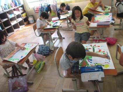お話の世界を想像して描いた絵の「見どころを鑑賞カード」を書きました。