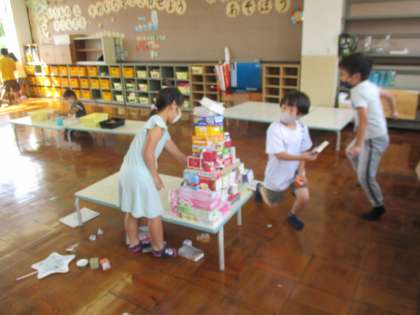 生活「あそんでためしてくふうして」の材料で,特徴を活かした遊び方を考えています。