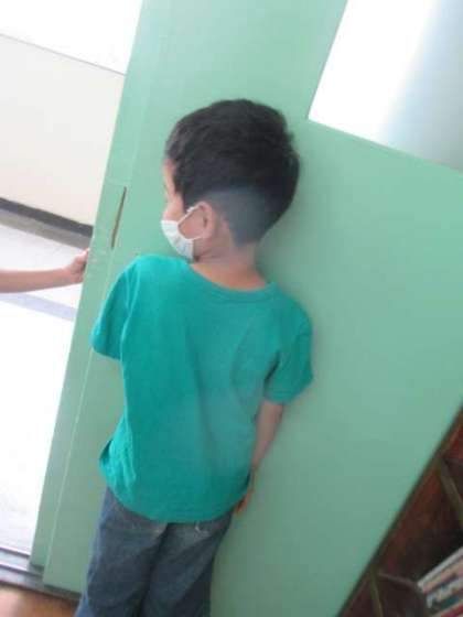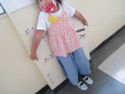 たこは,体の色をまわりの色と似た色にかえてかくれることを学習した日,みんなでたこになって,自分の服の色と似ているところにかくれてみました。どこにしようかと,必死に探していましたよ。