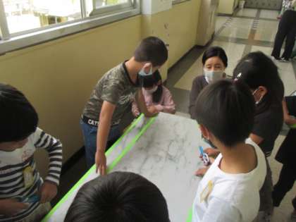 算数の時間,リボンを使って2つのものの長さを比べる活動をしました。給食台とオルガン,どちらが長いでしょうか!?正解は,お子さんに聞いてみてくださいね!