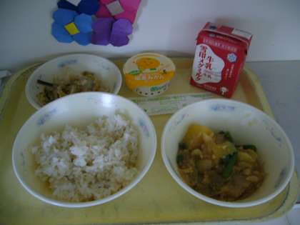 今日の給食の献立は,麦ごはん,牛乳,じゃがいものそぼろ煮,ごま酢煮とみかんゼリーでした。おいいくいただきました。食べ物には,赤・黄・緑の三つの働きがあります。それぞれ大切な栄養です。何でも食べて丈夫な体を作りましょう。