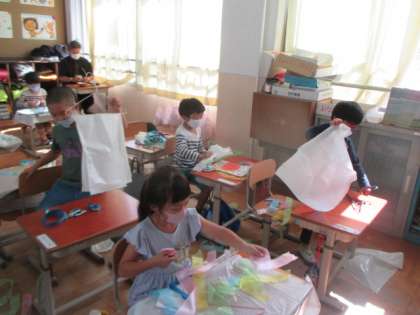 ひらひらゆれる紙テープやスズランテープをハンガーにつけて飾る創作活動をしました。風に揺れてきれいです。続きはまた来週に・・・!