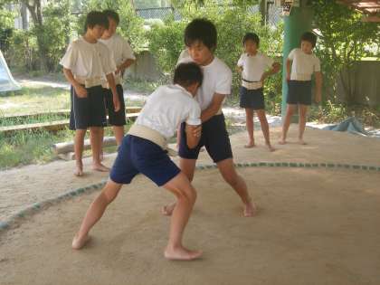 中間休み時間に,土俵で相撲のけいこをしているところを,教育長の高桑先生が見に来られました。お顔が見せるなり,「おはようございます。」と,60名が大きな声で挨拶しました。休み時間ということもあり,1年生も来てよいこととなっているので,1年から6年まで合わせると人数はもっといたかも知れません。