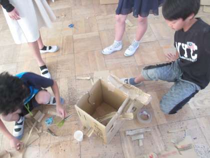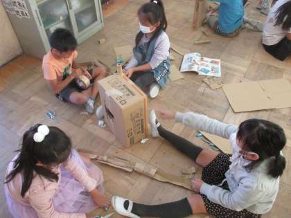 図工の時間に段ボールでビー玉を転がす仕組みを作りました。傾斜を調節しながらうまくビー玉が転がるように組み立てていました。