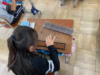 算数の時間にそろばんをしました。まずは指定された数をそろばんに入れる練習からしました。時間の最後にはみんなきちんと入れることができていました。
