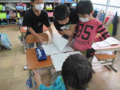 調べ学習をしている友だちのノートには自然とたくさん人が集まって,ノートに書いてあることを読んで楽しんでいます。