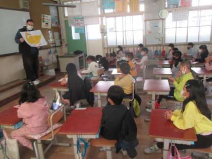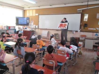 今日はデイビット先生に大型絵本を読んでもらいました。英語で色や動物の名前を言って,楽しみました。