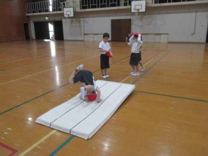マットあそびの学習,楽しかったね!きれいに前ころがりや後ろころがりができました。マットの上に赤玉が並んでいるのは,まっすぐきれいに回るためのアイデアです。赤玉に触らないようにまっすぐまっすぐ!!