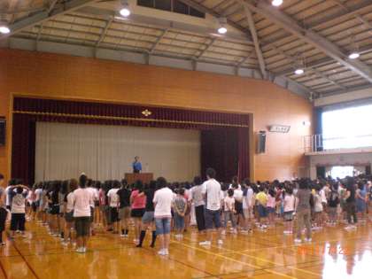 校長先生のお話のあと、町田先生・本多先生から安全に楽しく夏休みの過ごす方法を教えていただきました。