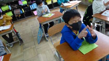 友だちと手をつないで遊ぶことができないので,自分自身の手遊び歌に変えて楽しみました。