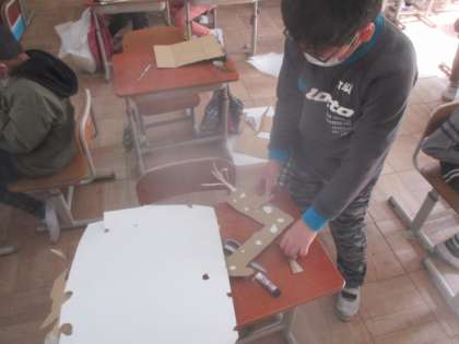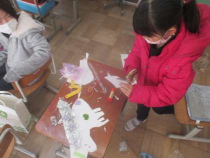 画用紙や緩衝材,毛糸,段ボール,ストローなどを切ったり貼ったりして生き物を作りました。