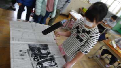 インクをつけて,ばれんでスリスリ・・・自分で刷りあげた版画は,特別な思いがあるようでした♪