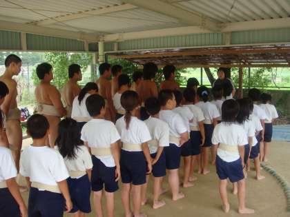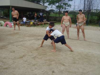 醍醐西小学校とは2回目,春日丘中学校相撲部員全員とは初めてとなる合同稽古をしました。池田小学校の夏の相撲練習は2〜6年生まで同じ時間帯に稽古をするので,たくさんのグループに分けました。自分のあった人と練習をしながら,中学生にアドバイスを受けました。池田の6年男子は中学生とも相撲をとらさせてもらいました。最後は,中学生による「ぶつかり稽古」や「相撲をとる」ことなどを見せてもらいました。迫力があり,見ている人は思わず,「うわあ」「すごいなあ」と声をあげていました。めったに見られない光景なので,池田の相撲担当以外の先生も見てくれていました。