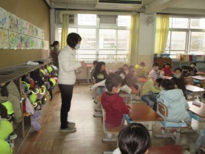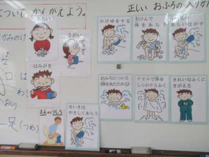 学活の時間、「きれいなからだ」について学習しました。体の中で汚れやすいところはどこかを考えたあと、なぜきれいにしないといけないのかや、きれいにする方法をみんなで確かめました。正しいお風呂の入り方を確認しているとき、子どもたちが「えっ!?」となったのが、体を洗ってから湯船につかることでした。みんなでお風呂に入るまねをしながら確かめました。