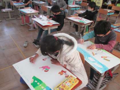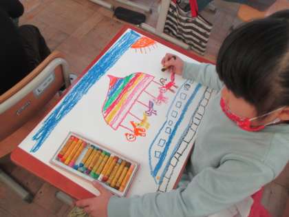 なにに乗ってどこに行きたい??子どもたちにとってまさに夢のような題材で絵を描きました。初めは「飛行機に乗ってハワイ〜!」と言っていた人も、いざ画用紙に描き始めると、「お花に乗って海〜!!」に変わっていました。やっぱりそっちが楽しいよね♪子どもたちの行きたいところは,無限に広がります!先生も行ってみたいな…。