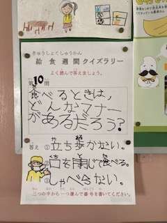 そこで,今年度は給食委員会の児童が作成してくれた給食のクイズラリーに挑戦しました。子どもたちは校内に掲示されているクイズを見つけるのもクイズを解くのも楽しくて,大喜びでクイズに挑戦していました。