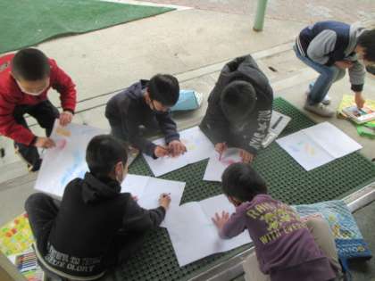 でこぼこしたところに紙を当て、色鉛筆でこすると…!?きれいな模様が浮き上がります。活動内容の説明を終えると…!またまたあっという間に教室から人がいなくなりました。すぐさま、いろいろな場所のでこぼこを大捜査!「みんな〜!12時には教室に帰ってきてね〜!!」