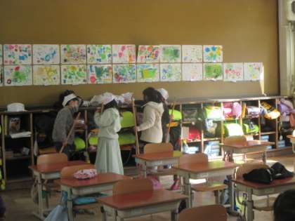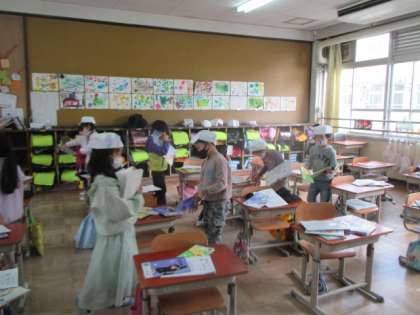 さて、楽しい図工の時間が終わり、給食→昼休み→掃除の時間となりました。ふと見ると…!!帽子屋さん発見!そのまま掃除が終わり、配りものタイム→お直しタイムとなりましたが…。よっぽど楽しかったのでしょうね。気に入ってくれてうれしいな。1年生の可愛さあふれるショットをどうぞ♪