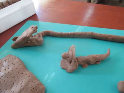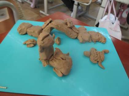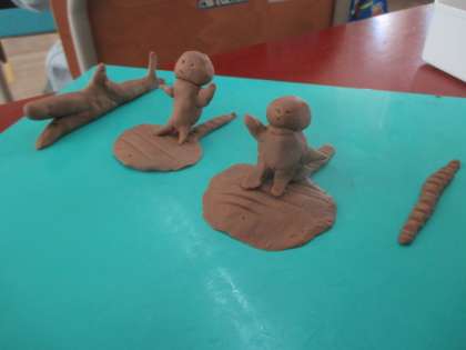 図工の学習は、本当に楽しい題材が多いです。1年生の心をうま〜くくすぐってくれます。今回は、一緒に散歩したい生き物や場所を想像して、粘土で表現しました。お散歩しながら話している声が聞こえてきそうですね♪楽しそう!
