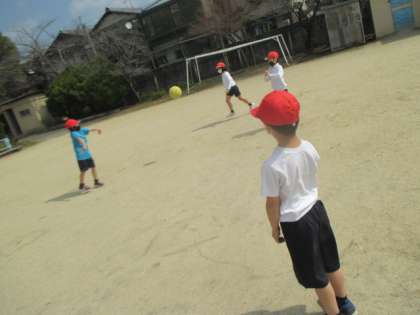 先週までは,ボールけりあそびをし,今週はパスあそびをします。