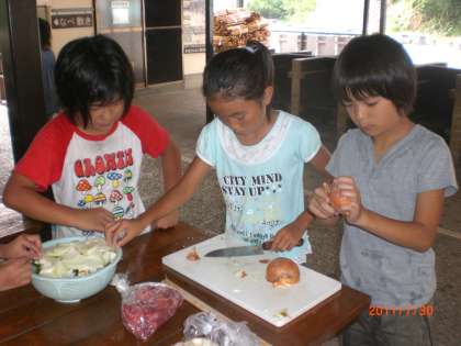 野外炊事の調理係は,食材の野菜やお肉を切って準備を進めています。