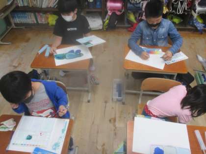 今日の図工の学習は,水や絵の具の量を調節したり,いろいろな絵の具を混ぜ合わせてみたりして,線や丸,絵などを自由に描きました!