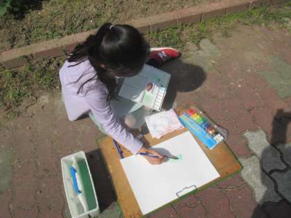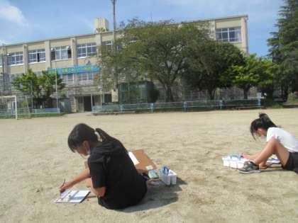 大好きな池田小学校の校舎を絵の具を使って描きます。